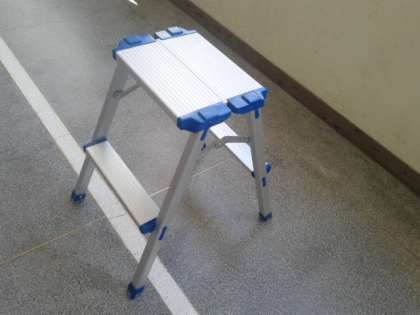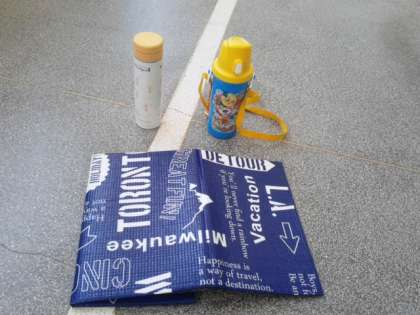 水筒・敷物は校内にありました。脚立は、学校北側の壁沿い(校外)にありました。