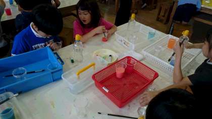 絵の具を使って、色とりどりの色水=ジュースをつくりました。