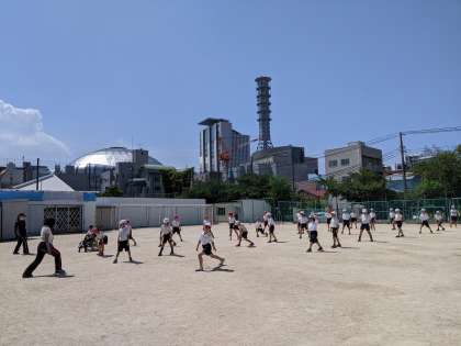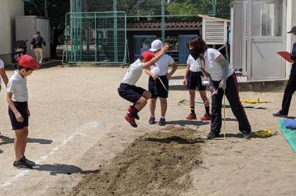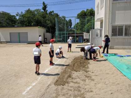 写真は3年生の立ち幅跳びの測定の様子です。しっかり準備運動をして、待つ間は日陰て待機し水分補給をするなど、熱中症対策も工夫しています。3カ月の休業を挟んで、子どもたちの体力はどうなっているでしょうか・・・!。 -