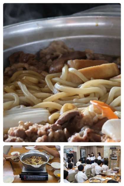 夕食の時間になりました。今日の献立は、すき焼きです。うどんも入ってボリューム満点。ちなみに肉は和牛を使用しています。