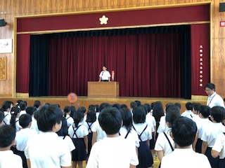 最初、武道場で中学校の校長先生や生徒会会長などの話を聞きました。