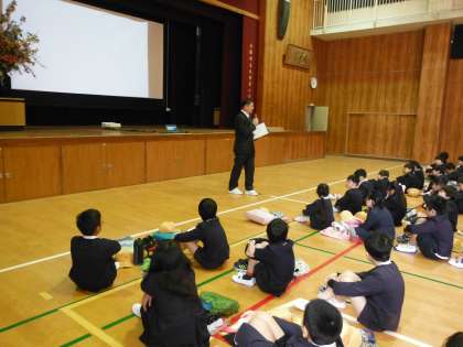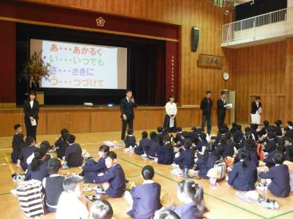 本日〔4月8日(月)〕、2年生から6年生と教職員で新しく着任された先生方の着任式を行った後、今年度の始業式を行いました。始業式の終了後、3年生の転入生の紹介と担任発表がありました。