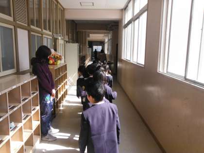 昨日の対面式後の様子です。担任の先生のお話の後、校内を探検(お散歩?)しました。保護者のみなさま、毎日、学校でのできごとを聞いて、お話してみてください。よろしくお願いします。