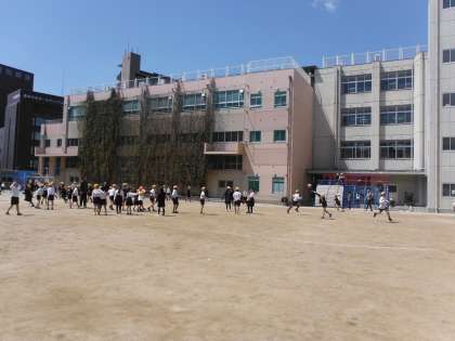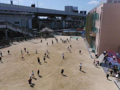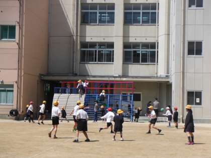 今日は天気も良く、子どもたちは元気よく運動場で遊んでいました。担任の先生や新しく着任した先生たちも運動場に出ています。1年生たちはコンビネーション遊具(※)をとても気に入ってくれたようです。