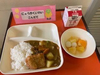 4月10日(水)の給食は、カツカレーライス、フルーツ白玉、牛乳の「入学祝い献立」でした。