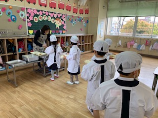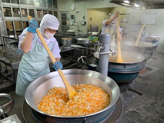 2枚目の写真は、1年生がカレーのおかわりをしているところです。