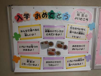 給食・食育関係の校内掲示です。一年生が入学し、新年度になりましたので「給食のよいところ」の解説です。