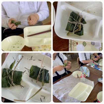 ちまきは、米の粉で作ったもちを笹の葉でまいています。焼き物機で蒸して提供しました。