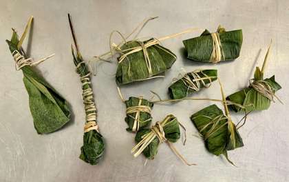 食べ終わって時間があった人は、笹の葉をくるくる巻きました。いろいろな巻き方があったようです。