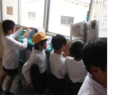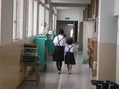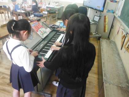 ここ数日の休憩時間(晴れの日のみ)の教室や廊下の様子です。上の写真は4年生がブックトラックの本やこども新聞を読んでいます。真ん中の写真は、1年生が6年生と一緒に校内をお散歩・探検しているところです。下の写真は3年生が教室でオルガンを弾いているところです。