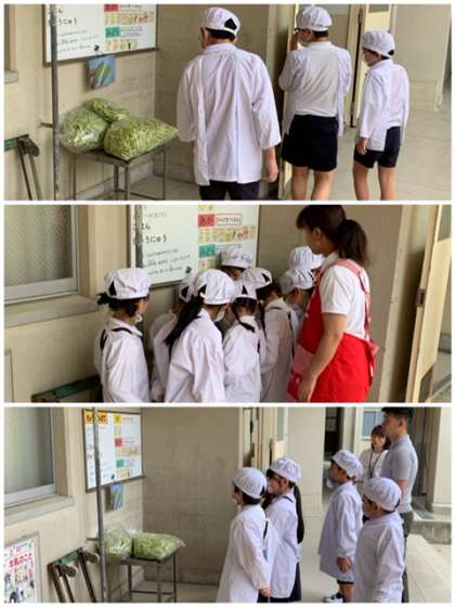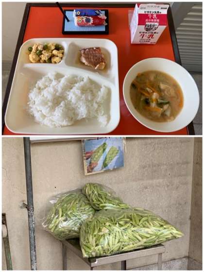 給食室前にえんどうのさやを置いていると、給食当番の子どもたちは「なにこれ?!」「わあ!すごい!」「いっぱ〜い!」と驚きながら見ていました。