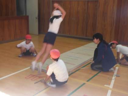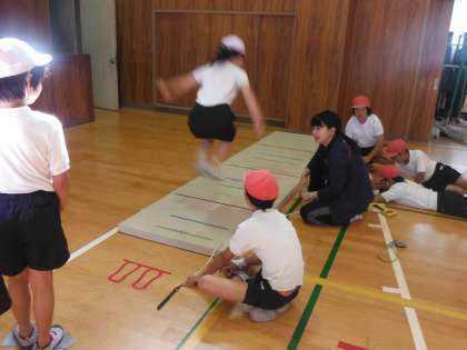 反復横とびに続き、立ち幅跳びに取り組みました。男子も女子もしっかりと深くしゃがみ込んで、上へ高く跳び、足を前に出せている子どもがたくさんいました。170センチメートルに届いた児童(男女)も数人おり、最長は男子で180センチメートルを超えました。