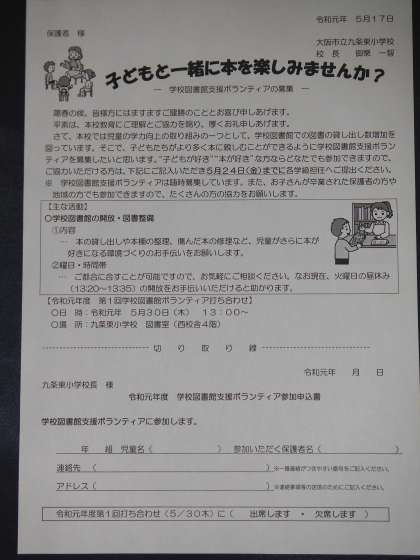 先日、申込書を配布させていただきましたが、校内の読書環境を充実させるために図書室のボランティアを募集しています。ご都合に合わせることが可能ですので、お気軽に申し込んでいただきたいと思います。お手伝いいただく内容につきましては、熱心に取り組んでいただいている図書支援員の先生から丁寧に説明させていただきます。よろしくお願いします。