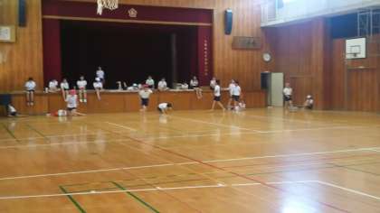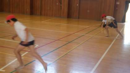 シャトルランの測定風景です。往復持久走とも呼ばれる、有酸素運動能力を測定する種目です。写真の中に座り込んでいる児童が何人も写っていますが、かなり持久力が必要とされます。下の写真は最後の一組の激走シーンです。二人とも、ものすごい迫力でした。みんな、最後までしっかりとがんばってくれました。