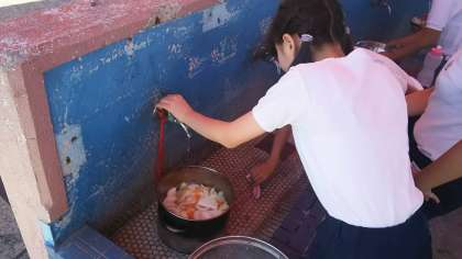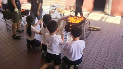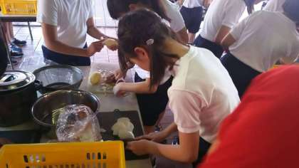 いよいよ準備が整い、事前に決めた役割に従って、野菜やお肉を切る係、カマドで火を点ける係等、手分けして作業を始めました。特に調理担当は、これまでの家庭科の学習で取り組んだ調理実習の経験を活かしているようです。