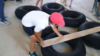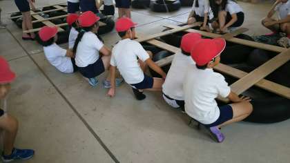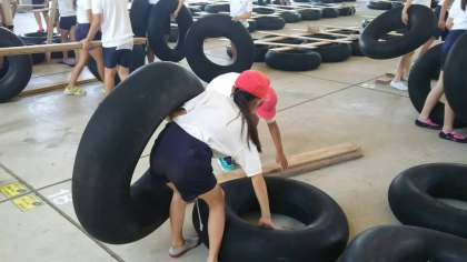 昼食のカレーライスを堪能したあとは、午後からの活動で使うイカダ作りに挑戦しています。