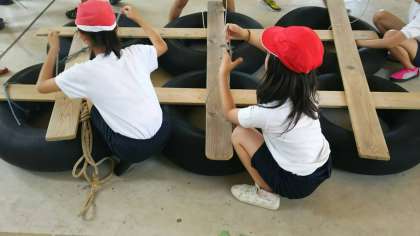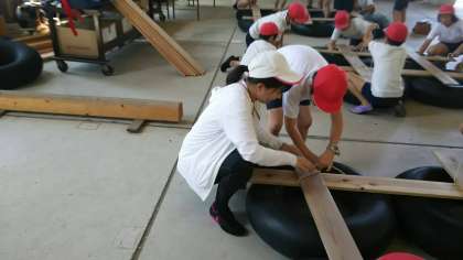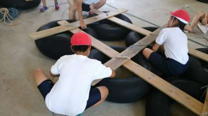 浮きとなるゴムタイヤが外れてしまわないよう、しっかりと固定しながら、少しずつイカダらしい形に仕上がっています。