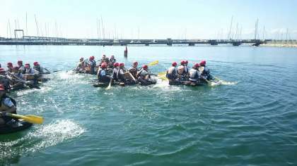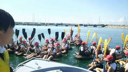 最後には、お互いのイカダ同士で水を掛け合って遊び、いよいよ陸上に上がりました。