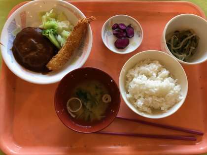 宿舎でいただく今日の夕食は、ハンバーグ・エビフライ…と子どもたちの食欲をそそるメニューとなっています。