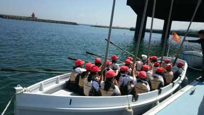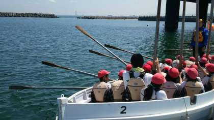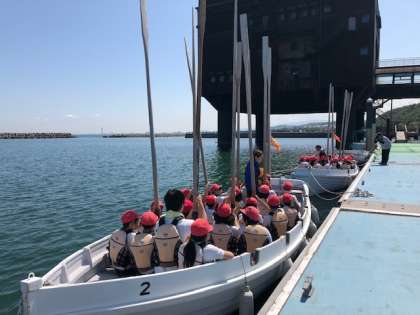 そこで最初に櫂の扱い方の練習をしましたが、それなりに重い櫂を立てたり下ろしたりするのは大変でしたが、ペアとなっている友だちと一生懸命に頑張っていました。