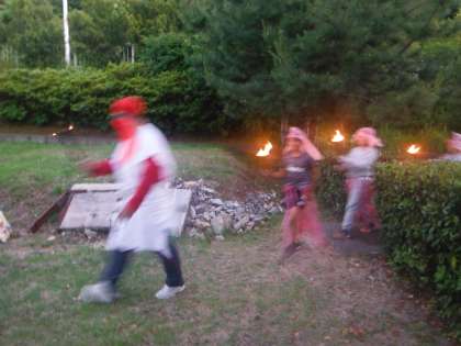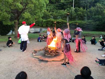 最初にみんなで心を一つにして「遠き山に日は落ちて」を歌った後、火の神と四人の火の精霊が神聖な火をみんなのもとへ運んできました。