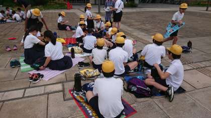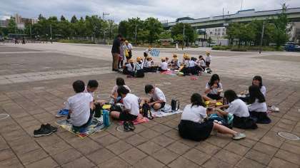 お昼ごはんは歴史博物館を出たところの広場で食べました。少し風は強かったですが、過ごしやすい天候で、おうちの人に作ってもらったお弁当をみんなでおいしくいただきました。
