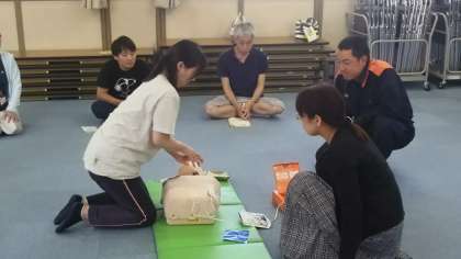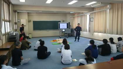 昨日〔6月20日(木)〕の午後、西消防署の職員の方々に来校いただき、本年度の救急救命講習会を多目的教室にて開催しました。教職員といきいき教室の運営指導員の先生、保護者の方々が参加されました。DVDの視聴や実技・ロープレ(胸骨圧迫のやり方やAEDの使用方法等)、質疑応答と時間をかけて非常に丁寧に指導していただきました。