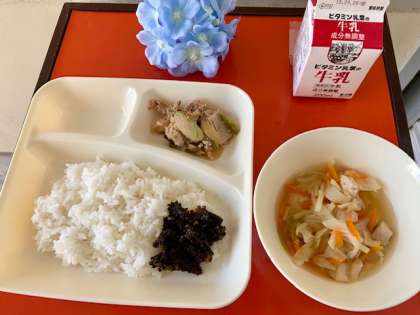 6月25日(火)の給食は、ごはん、豚肉のごまみそ焼き、すまし汁、のりのつくだ煮、牛乳でした。