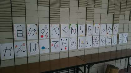 いよいよ、明日〔7月6日(土)〕はこどもたちが楽しみにしている「九条東フェスティバル」です。今年のめあては「自分のやくわりをしっかりがんばって 楽しいお店にしよう!」です。各班(1年生から6年生で構成する「たてわり班」)毎にお店を運営するチームと他班のお店を回るチームに分かれて行動します。準備も全学年で力を合わせて行いました。