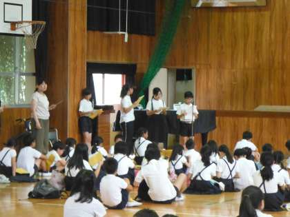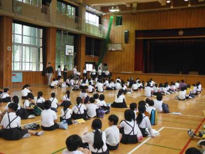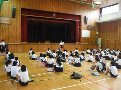 写真は開会式の様子です。児童代表の「はじめの言葉」で始まりました。今年のめあてと注意事項を確認し、各班に分かれてスタートしました。