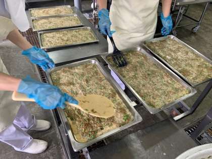 きょうの給食のヒラヤーチーは、卵と水を混ぜ合わせ、小麦粉、でんぷん、塩、うすくちしょうゆ、粉末のかつおぶしを混ぜ合わせ、にらともずくを加えて焼き物機で焼きました。