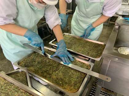 みりんと酢、こいくちしょうゆ、水で作ったたれをかけて、切り分けて配缶していきました。