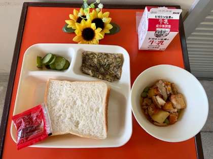 7月8日(月)の給食は、食パン、いちごジャム、もずく入りヒラヤーチー、豚肉といかの煮もの、あっさりきゅうり、牛乳でした。