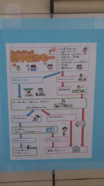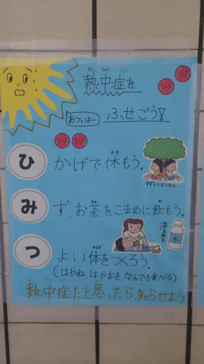 健康委員会で作成してくれました。玄関や各階の階段等に掲示してくれています。本格的に暑くなってきました。こどもたちの熱中症対策と健康観察をよろしくお願いします。