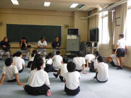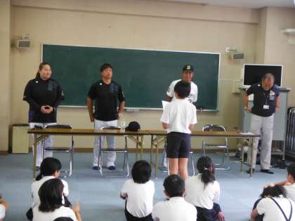 昨年度に引き続き、本日〔7月11日(木)〕の2校時、オリックス・バファローズ少年少女野球教室から4名の方々に来校いただき、6年生にキャリア教育の授業を行っていただきました。「小さな目標を常に持って、やりつづけよう」、「みんなと会話ができる様に色々な言葉やあいさつを身につけよう」、「恥ずかしがらずにどんどん自分の意見や気持ちを伝えよう。間違えることは恥ずかしいことではない」、「嫌なことや苦手なことにも自分から挑戦してみる」「夢や希望をかなえるために、色々なものをバランスよく食べて健康になることが大事」等、たくさんのことを教えていただきました。