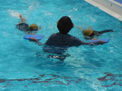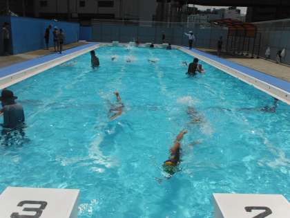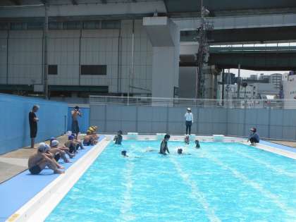 4年生、5年生、6年生です。ウォームアップ後は泳力別に分かれて泳ぎます。一人ひとり、上達することを目指しています。昨日、今日と連続で参加している子どもたちもたくさんいます。