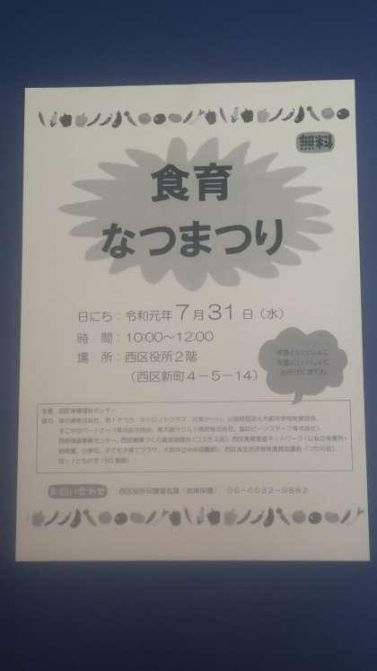 今月末に西区役所にて「食育なつまつり」が開催されます。園児や低学年が色々と楽しめる内容になっています。ゲームやおはなし、キーホルダーや小物を作るコーナーなどがあります。校区外ですので交通安全にご注意ください。