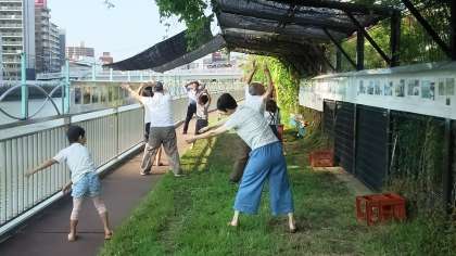 本日〔7月29日(月)〕より千代崎連合振興町会のラジオ体操が始まりました。午前7時30分から始まります。アドプトリバーでは新しいビオトープも完成しており、あさがおの花もきれいに咲いています。