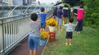 本日〔8月4日(日)〕で、今年の千代崎連合振興町会のラジオ体操は終了しました。最終日の今日は、会場できれいに咲いていた「ルドベキア」の花も参加者全員に配られました。