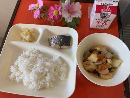 9月3日(火)の給食は、ごはん、さごしの塩焼き、じゃがいもと一口がんもの煮もの、キャベツのおひたし、牛乳でした。