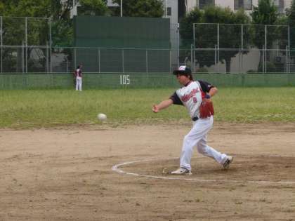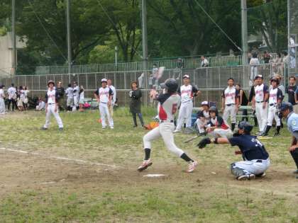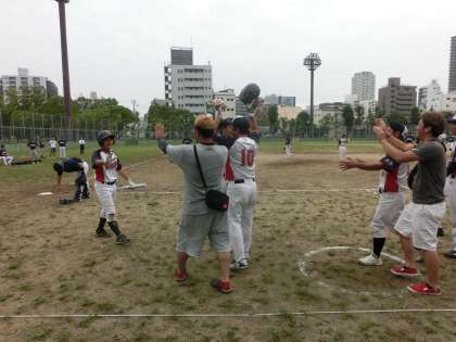 1日(日)の一回戦の写真です。明治小チームを相手に7対6での劇的な逆転サヨナラ勝ちでした。下の写真はサヨナラ勝ちの走者がホームインした時のものです。