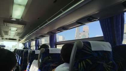 休憩場所の上野ドライブインに到着しました。車内ではみんなでクイズをしたり、歌を歌ったりと楽しんでいます。体調を崩す児童もおらず、順調に目的地に向かっています。