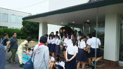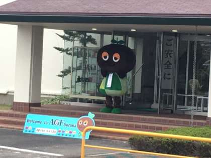 ホテルから近いので、15分もしないうちに到着しました。到着すると、公式キャラクターの「ビーン太くん」がお出迎えしてくれました。みんなで一緒に記念写真を撮り、工場内へ入っていきました。