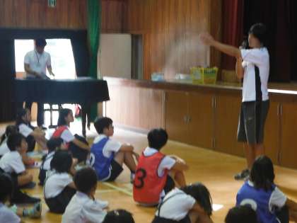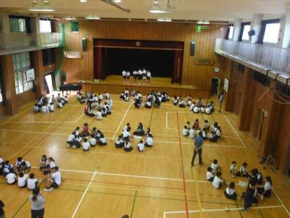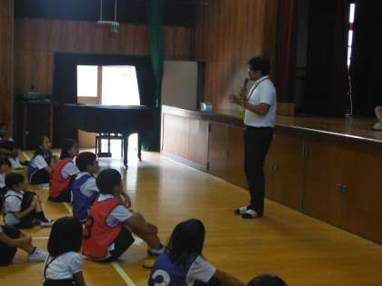 今朝の児童集会は学校クイズでした。児童の総人数や鉄棒の数、教頭先生の名字などが出題されました。クイズの後、新しいC−NETの先生の紹介があり、最後に本格的に始まった運動会の練習に関する注意事項のお話がありました。