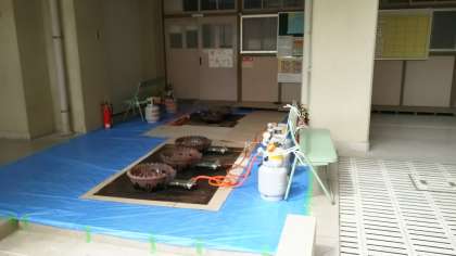 「九条東 ふれあい運動会」、「校庭キャンプ」の準備風景