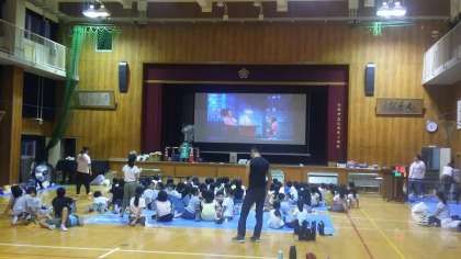 今年も校内で肝試しが行われます。子どもたちは講堂で映画を観覧中ですが、順番に班ごとに校内を回ります。