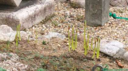 ※写真は左が今年の9月24日(火)に芽が出てきたところ、右が現在の写真です。運動場の池の所に咲いています。昨年は9月26日に花を撮影していますので、昨年より約一週間ほど、開花が遅れています。