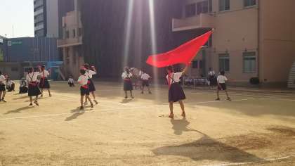 昨日の6校時の運動会の準備風景です。上の写真が準備係(円を書く練習)、中央が白組、下が紅組の応援団です。