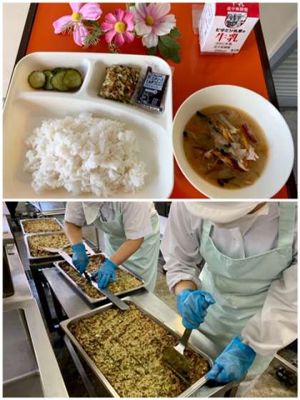 10月16日(水)の給食は、ごはん、お好み焼き、豚汁、きゅうりの甘酢あえ、牛乳でした。