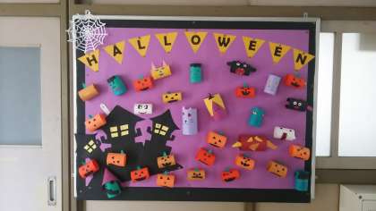 1階の保健室の横の掲示です。色使いがきれいで雰囲気がとても出ていると思います。本日〔10月23日(水)〕の日中の天気予報は「晴れ」。秋晴れの1日となり、休憩時間には、子どもたちは運動場で気持ち良く過ごせそうです。